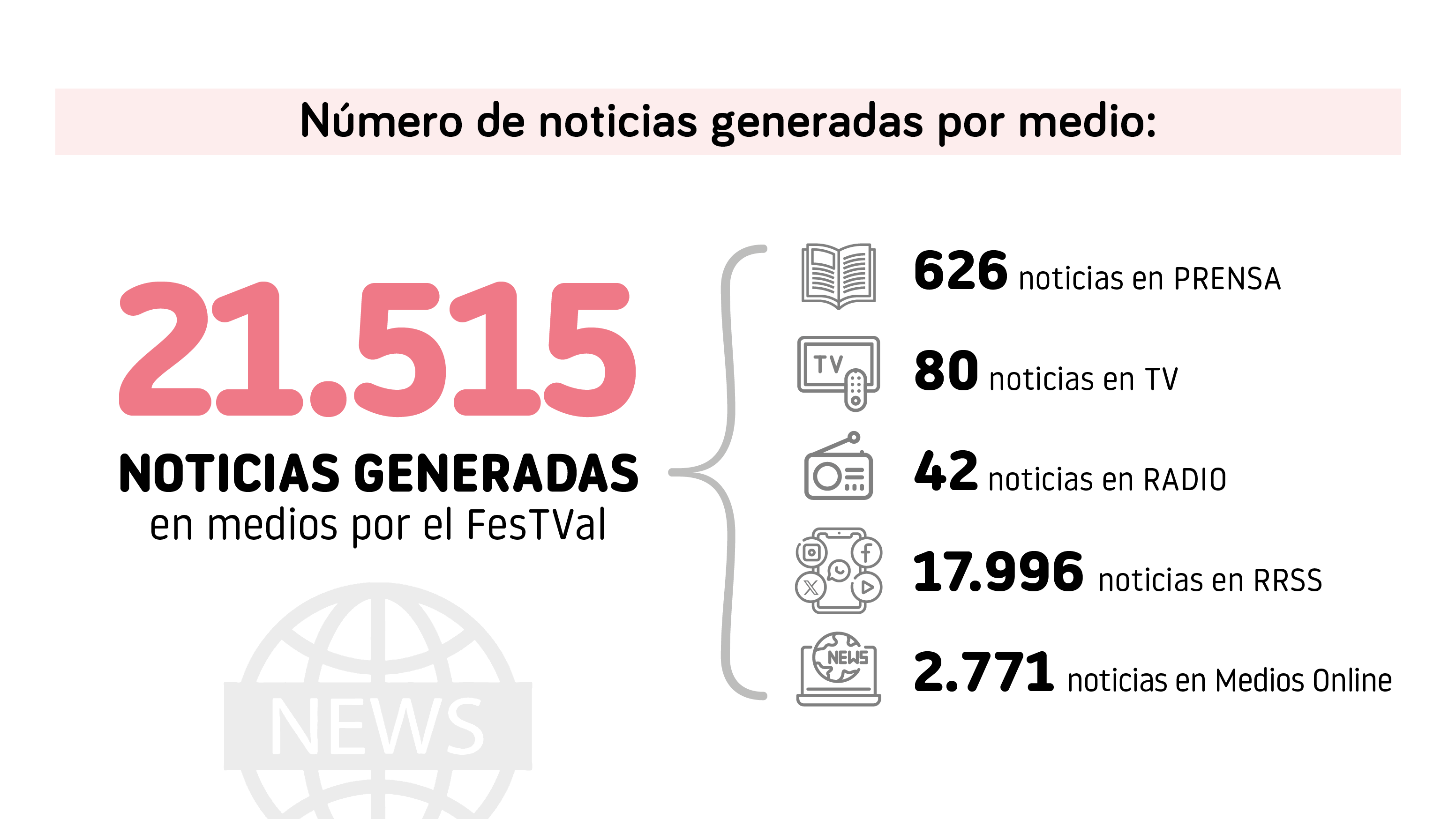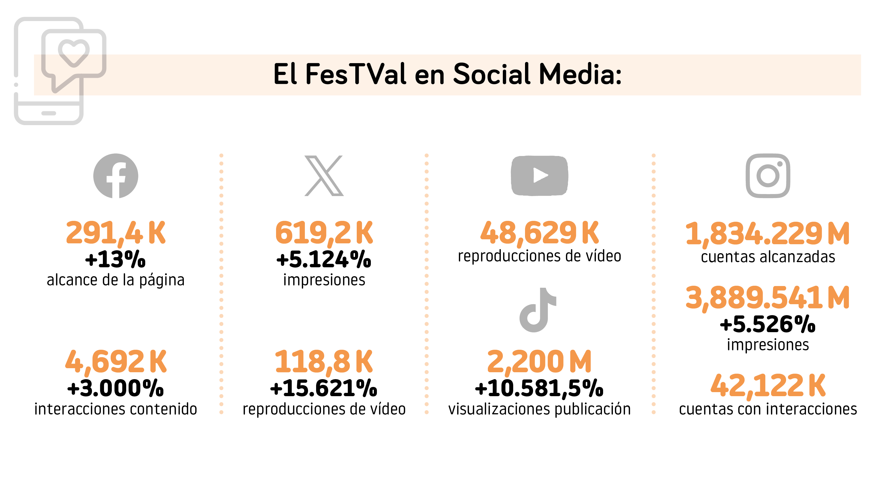 El número de noticias generadas por el FesTVal superó las 21.500 con un alcance en términos de audiencia de 10.900 millones de contactos entre los diferentes medios de comunicación evaluados. El crecimiento del FesTVal en cuanto a presencia en los diferentes canales de social media también experimentó un crecimiento espectacular tal y como se muestra en la infografía adjunta.